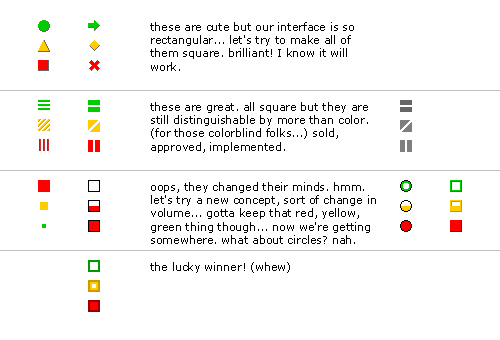 Icons were needed to communicate the project-management concept of red, yellow, and green as indicators of projects' condition. Challenges were inherent in the visual intensity of the colors, and our desire to make all 3 icons square to blend with the rectangular interface, but still make them different to the eye of a colorblind user.
